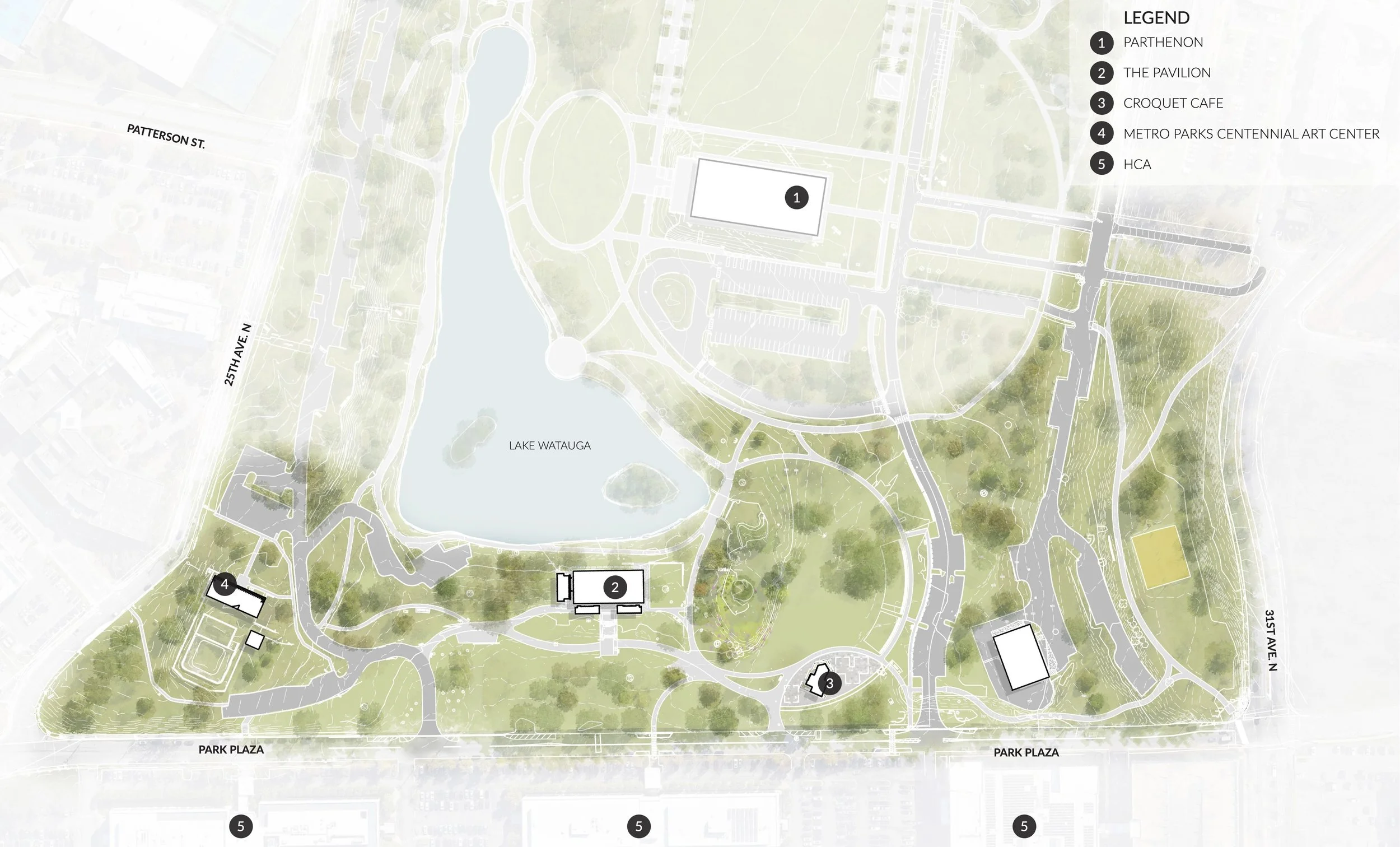 The Sunken Garden and Lake Watauga Walking Trail will be accessible for most of the construction schedule. Brief closures of these amenities will be announced in Summer of 2026. We apologize for any inconvenience and hope you are as excited as we and Metro Parks are for the fantastic improvements coming to Centennial Park!