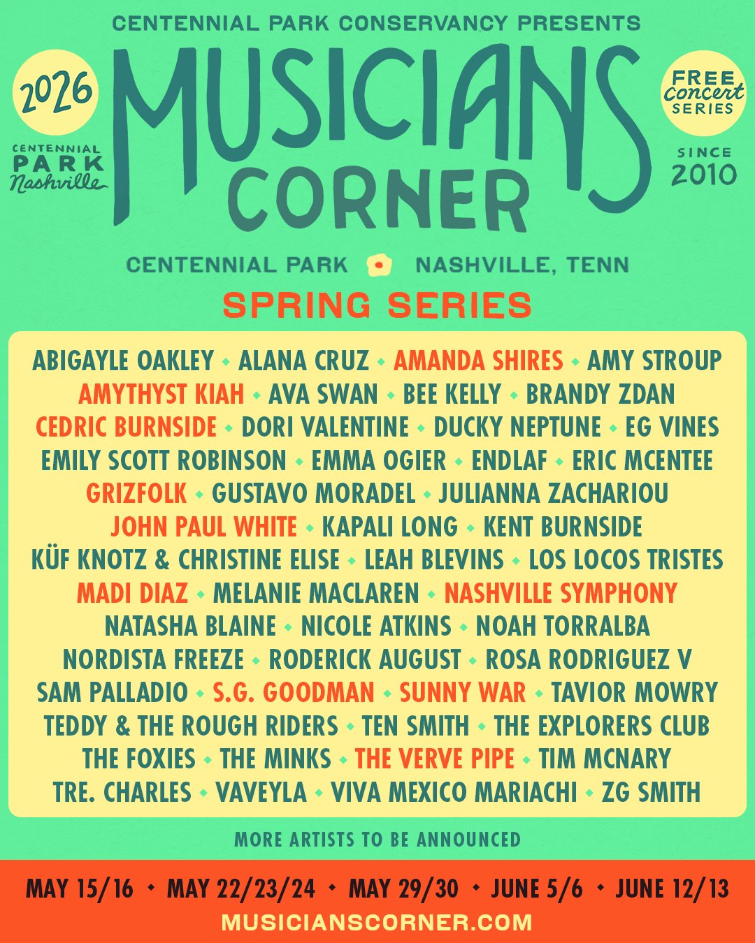 “Musicians Corner is back,” said Justin Branam, Executive Producer of Musicians Corner. “This free, family-friendly event has become a beloved Nashville tradition and a way to celebrate our city’s diverse music community. The mix of up-and-coming talent and legendary acts has always been a hallmark of Musicians Corner, and this season will be no different. We look forward to the Nashville community joining us at Centennial Park this spring with friends and family.”